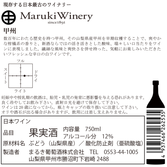 数百年にわたる歴史を持つ甲州。その山梨県産甲州種を早期収穫することで、爽やかな柑橘系の香りと、新酒ならではの活き活きとした酸味に、瑞々しい口当たりを表現しました。繊細な風味と爽快さを併せ持った、気軽にお楽しみいただきたいフレッシュな辛口の白ワインです。
